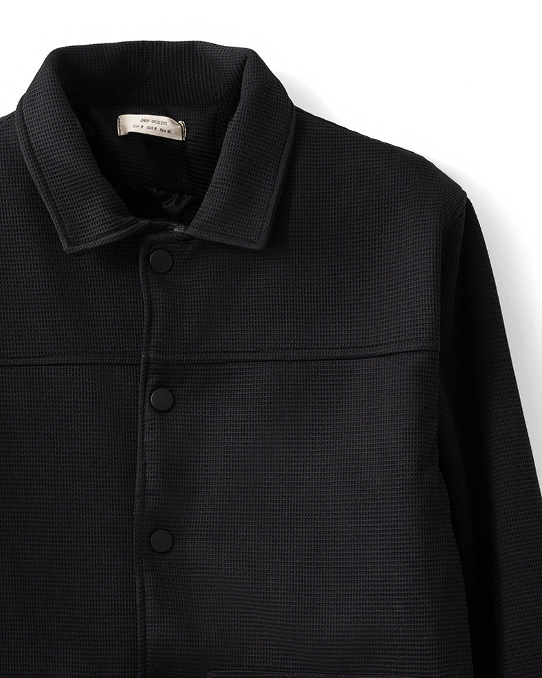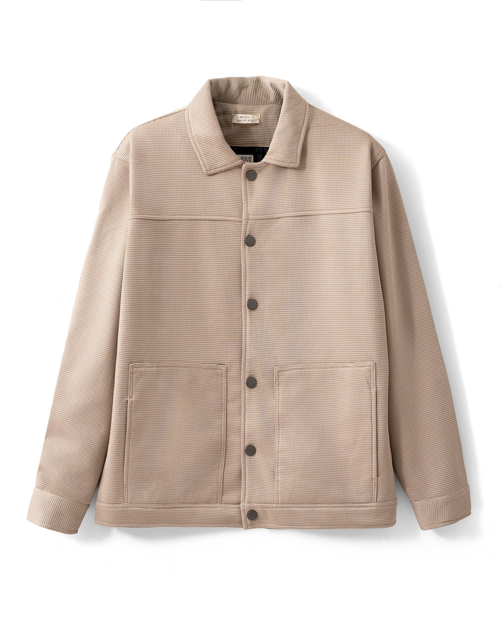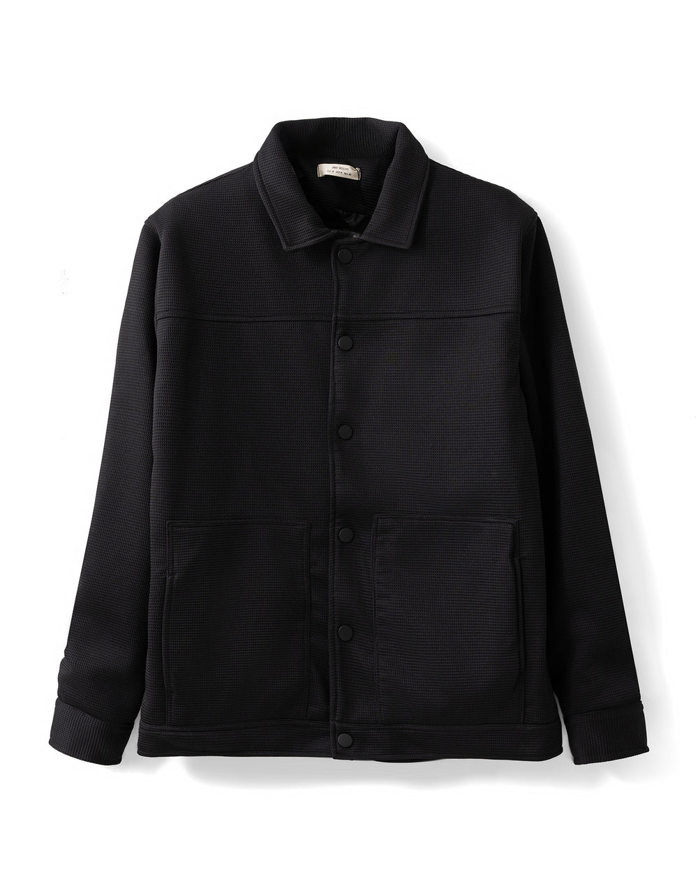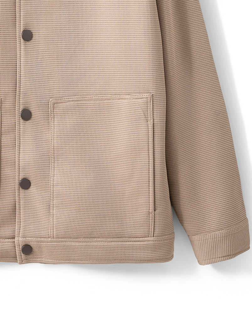 A textured jacket crafted from a soft woven fabric, designed with a relaxed fit and clean utility details. Finished with front snap buttons and spacious pockets for everyday wear.